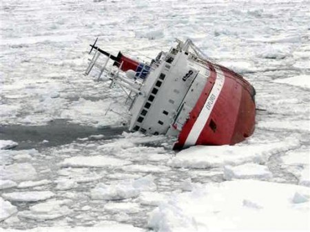 11月23日公布,一艘探险巡洋舰在南极海岸撞到冰山数小时后沉没。船上的100名乘客与工作人员均平安脱险。智利海军Handout摄。