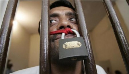 2007年11月20日,一名嘴上上锁被逮捕的记者。由于抗议当局对媒体的管制和紧急状态政策,一名记者在巴基斯坦海得拉巴被逮捕。Akram Shahid摄。