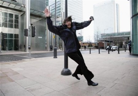wharf,一名女子被风吹得双脚离地。18日,严重的大风天气袭击英国,造成交通瘫痪、建筑物损毁。Jonathan Bainbridge摄。