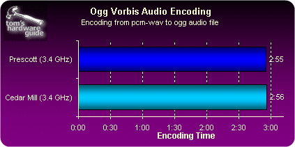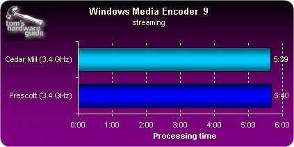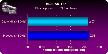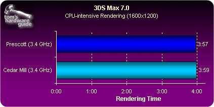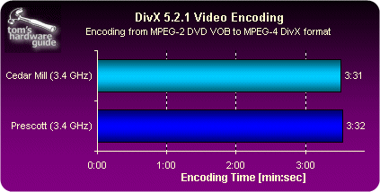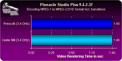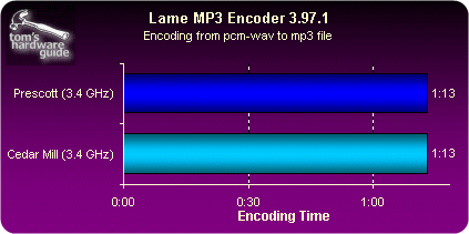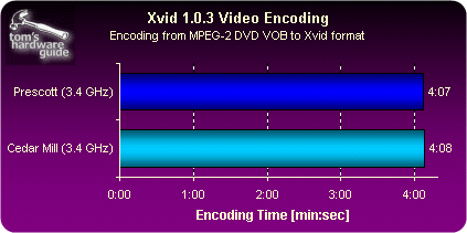 相比早先的Prescott核心,Cedar Mill(3.0到3.6GHz)的设计功耗从95瓦下降到了86瓦,而通过我们的实际测试,在满负荷情况下Cedar Mill的功耗比Prescott(同为2MB二级缓存)下降了20%,由此以来Intel在处理器“每瓦特性能”对比中与AMD差距进一步缩小 |