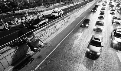 |   别克冲破护栏,半个车身悬半空,下面就是三环主路摄/法制晚报记者 郭谦