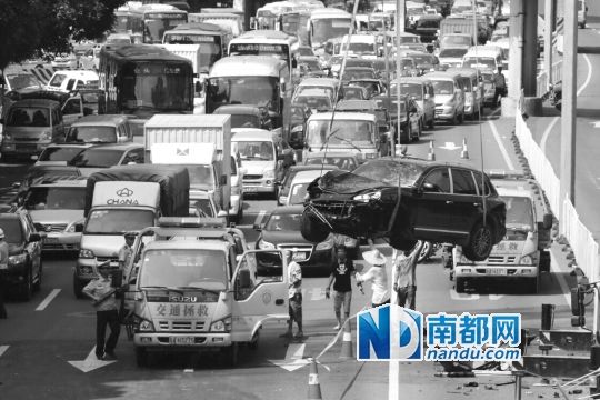 |  肇事的卡宴被吊上拖车,事故造成海印桥路段大堵塞。南都记者 张志韬 摄