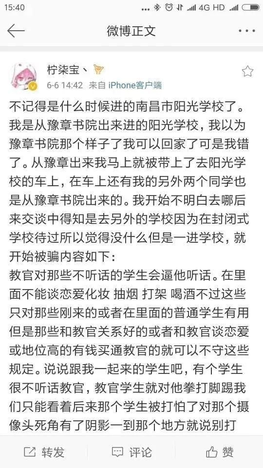 日前,博主“柠柒宝、”发布微博称,自从豫章书院在去年被爆出存在严重体罚、囚禁学生的诸多问题后,自己从豫章书院离开转到南昌市阳光学校,在该校被封闭教育大约八个月时间。