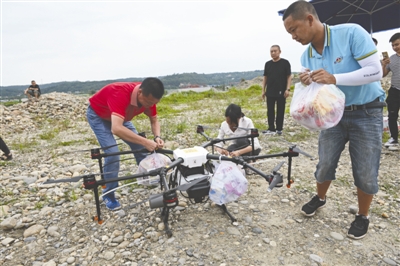 救急 无人机频繁起降 急送两车物资 下午4时开始,3架无人机陆续到位。这款原本用来喷洒农药的无人机,关键时刻派上用场,被临时抽调来执行物资运输任务。 在现场,工作人员准备了矿泉水、面包、饼干、手电及蚊香等物品,分装好后准备运往“孤岛”。 “从距离估计,往返岛上一次需要3分钟左右,无人机一次能承重10公斤。”操作人员介绍,虽然公司有5年的植保作业飞行经验,但运送物资还是头一次。 一切准备就绪后,下午5时30分,第一架无人机搭载着物资起飞,现场风大,为了保证安全,搭载的物品重量不超过5公斤。现场指挥人员拨通对岸人员的电话,要求在对岸降落处插一根红旗作为标志 ,随后操作手王波操作载有物资的飞机起飞。起飞后平稳飞行,对岸人员在电话中向操作员报告降落点距离,2分钟后,第一批四袋物资运抵岛上。 首飞成功后,第二架无人机随即起飞,随后,双机同时作业运送救援物资。 随着两架无人机的频繁起降,1小时后,两面包车的物资被无人机以“蚂蚁搬家”的方式,全部运送到被困人员手中。  无人机载着食品等物资飞过湍急的水面