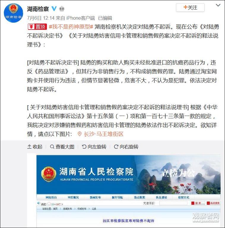 昨天(6日),湖南检察官方微博再次转发了其在3年前作出的决定,引来网友的叫好、同行的支持。有人评论,湖南检方的“再表态”不存在被民意绑架,反而是为避免出现不利舆情,值得点赞。 的确,陆勇最终可以“全身而退”,可以说检方功不可没。但此案得以通过“司法”和“道德”的双重考验,背后也有民意舆情的功劳。甚至可以这么理解:正是因为有舆情的介入,检方的调查工作才能“步入正轨”。 网友复习检方声明:“未被舆情绑架” 7月6日,湖南省人民检察院官方微博转发了其在2015年2月公布的《对陆勇不起诉决定书》和《关于对陆勇妨害信用卡管理和销售假药案决定不起诉的释法说理书》。简而言之,当时的检方认为,“陆勇案”与其他代购进口药案件的区别在于,陆勇的行为并非为了销售。  微博截图,两份声明附在文章最后