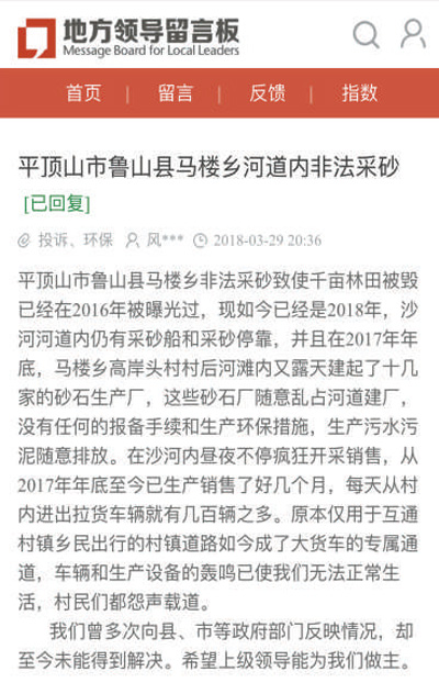 3月29日,有群众在人民网“地方领导留言板”上留言:马楼乡高岸头村有十几家砂石厂在沙河内疯狂开采销售。8月27日,有群众反映,在荡泽河观音寺乡孤山村段,大量砂石在河道中间堆积,阻拦正常泄洪,危及村民生命财产安全。