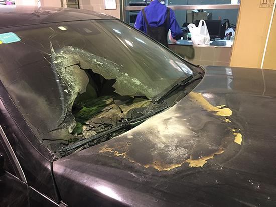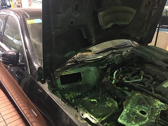 陆凤阳没想到,好好的车放在停车库里居然起火了。 6月1日,陆凤阳接到小区保安的电话,被告知车辆起火了。保险公司理赔员在前往现场调查后认为,车辆起火属于自燃,陆凤阳没有购买自燃险,不能得到保险补助。 6月19日,静安区公安消防部门检测认定:起火点为车辆发动机舱蓄电池处,因蓄电池发生故障起火。“认定书一出来,我6月20号就和奔驰厂家及4S店东驰公司人员作了交涉,对方提出必须将车辆拖到店里作检测后,再谈相关权益。” 陆凤阳说。  车辆外壳损伤。澎湃新闻记者 朱奕奕 图