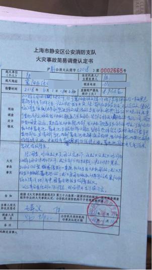 7月13日,4S店东驰公司及奔驰厂家将车拖走检测。9月20日,奔驰厂家的鉴定报告书迟迟未出,陆凤阳在追问检测的结果时,奔驰厂家技术人员回答“与公安消防鉴定结果基本一样”。当日,奔驰相关工作人员前来和陆凤阳谈赔偿。陆凤阳请求奔驰厂家将损坏的车恢复原状,恢复原状的费用根据4S店向奔驰厂家报价由配件成本费用330051元和工时总价28600元构成,共计358651元。 奔驰相关工作人员表示,只同意赔偿这辆车的残值,即同样的车款同样年份在二手车网站上的估价15.2万元及购置税。4S东驰公司表示,无法提供其他协商方案。 至今,陆凤阳的车仍停放在4S店中。澎湃新闻(www.thepaper.cn)记者在现场看到,这辆黑色的奔驰轿车前面损伤严重,车的电瓶基本被烧坏,副驾驶和前面的挡风玻璃也被烧坏。陆凤阳表示,将选择法律途径维护自身合法利益。 保险公司:车主没买自燃险不承担责任 车子着火后,陆凤阳对此事感到十分的疑惑。 6月1日晚7点左右,住在上海静安寺附近的陆凤阳接到小区保安的电话,“说地下车库冒烟了。我想自己的车停在角落处,应该不碍事。继续往前走,没走几步又来电话,说我的车着火了。” 据他介绍,起火车辆虽然是五六年前购买的,但是全程只跑了十万公里左右。事发前的一周,陆凤阳没有开过这辆车,车子本身没有通电。并且地下车库是比较阴凉的,6月1日这天不是高温天气,又事发在傍晚,温度也不高。 陆凤阳确认事发前车里面没有放置打火机、香水这样的易燃物,连纸巾也没有。车子也从来没有经过改装,电瓶都是原版的,而且都是严格按照期限去4S店做的保养。 事发后,陆凤阳打电话给保险公司,保险公司理赔员在前往现场调查后,给出的答复是车辆起火属于自燃,陆凤阳没有购买自燃险,所以不能得到保险补助。 公安消防:蓄电池发生故障起火 6月2日,陆凤阳到静安公安消防申请着火原因鉴定,希望对此次奔驰车“自燃”事件的原因作进一步的调查。 6月7日,公安部门派出专业人士到现场检测车辆着火原因。检测中需要车主提供失火车辆的全部保养记录,于是陆凤阳和负责维修的4S店东驰公司预约好,8日到店里拿全部的车辆保养记录。当天,保养记录原本已经全部打印好,然而当工作人员听说保养记录是用于火灾事故认定的,当场收回材料,无论陆凤阳如何哀求都不愿给出。 遭到拒绝的陆凤阳之后多次向4S店索要车辆保养记录,均被告知:“总部通知不准给”。陆凤阳表示4S店的做法很不合理,因为“车辆保养记录本来就是我作为消费者知情权的一部分”。最终,陆凤阳只能以另外一个名义,从其他渠道拿到了车辆保养记录。  公安消防出具的认定书。袁圆 摄