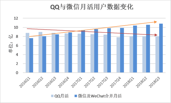 2016年第二季度,QQ月活跃用户数达到8.99亿的巅峰,自此开始持续下滑。2016第三季度下滑至8.77亿,2018年第三季度跌落至8.03亿。与此同时,微信用户数持续增长,微WeChat的合并月活跃用户数已经达到10.83亿。在即时通讯领域,QQ曾是最强大的工具,现在则由腾讯旗下另一款产品接过头把交椅。