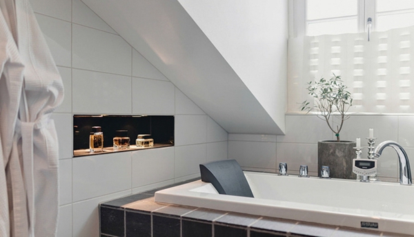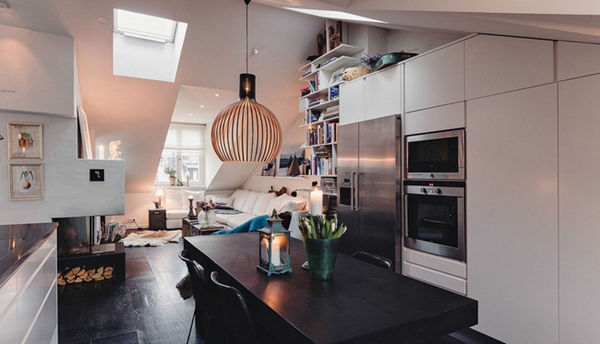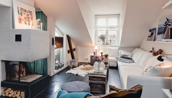 这间瑞典公寓居住面积为70平米,有两个房间。阁楼空间被充分利用,根据建筑造型定制了储物柜,整体墙面统一为白色,地板则选用深色,配合壁炉与毛毯营造出温馨与柔软的感觉,还有复古的灯具与烛台,在寒冬里有着别样的温情。