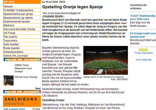 荷兰《电讯报》在报道中说:“本来门将斯特克伦博格受伤有些令人担心,不过现在看来他髋部的伤势无碍其出战同西班牙队的决赛。主帅范马尔维克在决赛中排出的首发与半决赛相比将会有两处不同,德容和范德维尔将会回归首发阵容,而上一场顶替他们二人的博拉鲁兹和德泽乌将会重新回到替补席上。”