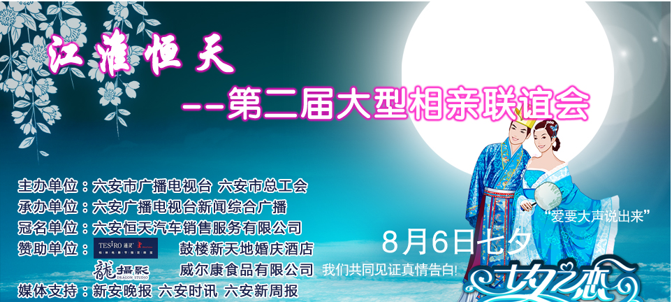 b、报名时间:2011年7月1日至8月1日结束 c、报名方式: 个人报名: 登陆六安论坛(www.6an.com)进行网上报名。(填写电子表格、提供电子照片)参与报名的男、女青年将由六安论坛进行海选,海选名单及相关资料交由主办方进行筛选,取得相亲资格的男、女青年将由主办单位通知本人携带相关证件(身份证、由单位或社区提供的单身证明、离异人士须提供离婚证明、大中专以上学历证明、2寸照片)来广电中心一楼办理报名手续 。 团体报名:由单位统计并填写“相亲会报名表”。