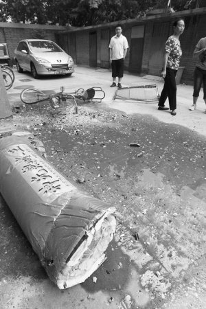 昨日9时30分,记者来到钟强小区2号院5号楼4单元楼前。太阳能热水器的水箱躺在墙角,水箱内胆裂开,真空集热管(俗称玻璃管)破碎,铁支架也变了形。单元门口的一辆自行车,车轱辘及车筐被热水器砸得严重扭曲,右车把也折断了。