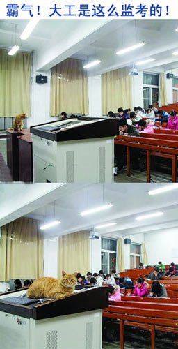 “监考猫”霸气监考 昨天,微博上一只小黄猫火了。网友李中冶上传了一只在讲桌上监考的小猫,教室里是在奋力做题的学生们。“霸气,大连理工大学是这样监考的!”网友们奔走相告,对这只充满了喜感的监考猫爱意有加,称呼它为“麦格教授”,麦格教授是《哈利·波特》中的一位主人公,她的变形状态是一只虎斑猫,在剧中,她戴的方形眼镜上的花纹就像是她变成猫时身上的花纹。 此监考猫在网上的迅速走红,让众多网友兴奋不已。大家在见到这只猫的第一眼时,立刻就被震惊了!此猫犀利的眼神,淡定的神态、怡然地在讲桌上行走的场景,总是让网友赞叹:“我一下子像是到了《哈利·波特》的场景里,期待着猫跳到半空中就变成麦格教授……”大家纷纷表示,这只猫绝对是《哈利·波特》里面的麦格教授,网友格芬兰多狮亲切地问:“麦格教授,你什么时候来的中国啊?” 然而,这只猫是在单独监考吗?这也引发了网友的怀疑:如果是考试,怎么同学们挨得那么近,不符合客观规律啊! 大家对于此猫的种种猜测,让人百思不得其解,当然“解铃还须系铃人”,记者联系到上传照片的大连理工大学学生李中冶。李中冶告诉记者,此猫确实是在考试现场,不过是在校学生会组织的一次四六级模拟考试的现场。“这只猫长年混迹于机械馆一楼的某一两个教室,已经很久了,从我来学校,学长和学姐们就说,这只猫早在他们来之前就已经存在了。”李中冶说,当天的四六级模拟考试没有监考老师,只有学生会的两个副部长在进行组织、监考工作,后来这只小猫来了,爬到桌子上,开始环顾四周,开始监考,很可爱。于是,他们便随手把它拍摄了下来。 据了解,这只猫被称为机械学院系猫,在全校都很出名,“基本上跟别人说起这只猫,大家都知道。”李中冶说,平常在上课或者上自习时,这只猫也经常出现,有时候它会在桌子上睡觉,同学们过来后,就来抚摸一下它的毛,捏捏它,它也很乖,一动不动。平时大家会带来各种东西喂它。