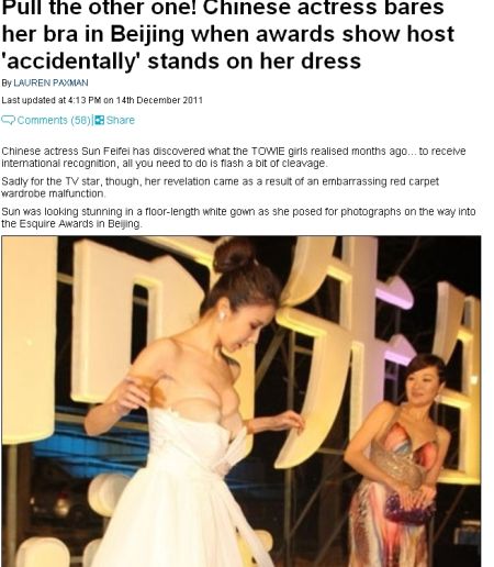 《每日邮报》报道称女星要想在红毯上获得国际关注,一种普遍的共识是撕开裙角,秀出乳沟,而孙菲菲遭遇的意外也充分证实了这一点。此次意外来源于一次尴尬的红毯走光事件。不过《每日邮报》提出质疑为什么在出现状况的时候,孙菲菲还要双手伸展开,而不是试图用双手去遮住她走光的地方?