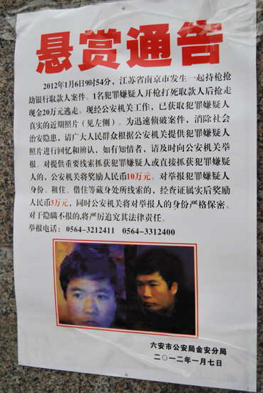 六安城区出现江苏南京银行枪击劫案嫌犯悬赏通告 ...