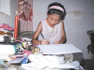 乖巧的锦玺在蜡烛下做作业 8月10日,对于弥勒县10岁的小女孩锦玺来说,是场噩梦。 10岁的锦玺含着眼泪被养父拖出大门,脖子上挂上一个“重金出售”的牌子来到弥勒县劳务市场。 “这么乖的姑娘,多少钱?”“少了10万不卖。”正当养父与人讨价还价时,弥勒县公安局巡逻民警来到现场,制止了养父吴海南重金卖女的悲剧。 他将养女抱往劳务市场卖 8月10日早上7点多,弥勒县和谐家园小区(廉租房),养父吴海南将还在熟睡的女儿锦玺从床上拉起来。 锦玺与养父争吵起来,想继续回到床上睡觉,但被养父拽住。养父接下来的举动让锦玺的瞌睡彻底醒了,吴海南在家里的一块小黑板上写下了“重金出售”字样,上面还留着自己的电话号码。 “看来养父这次是真要将我卖掉。”锦玺有点绝望,在此之前,养父曾经说过要卖掉她,但她只是以为她惹养父生气了,还对养父说,她以后听话,长大了会挣钱养活养父。然而,她的承诺没能打动养父。 10岁的锦玺说,在平时养父母无休止的争吵中,她得知,自己出生仅3天,亲生父母就将她遗弃在路边,是养母将其捡回来养大。 10年了,患小儿麻痹后遗症的养母艰难地把她养大,这一切,锦玺都看在眼里。想到这里,锦玺舍不得养母,大声地呼喊:“妈妈,我不想去。”听到女儿的喊叫,养母毕升觉得不对劲,一瘸一拐地来到女儿身边,将女儿抱住。 “从小就是我把她养大,你没帮什么忙,要卖连我一起卖了。”毕升与丈夫吴海南争吵起来。吴海南将毕升的手掰开,把女儿抱起来,提着小黑板走了。养母手无缚鸡之力,在力量上无法与丈夫抗衡,眼睁睁地看着丈夫把女儿带走。 养父声称没钱供养无奈卖女 在弥勒县城一劳务市场,养父将写好的牌子放在锦玺的旁边,然后等待买主的到来。看到有人卖女儿,很多人都围在一起。 “多少钱啊?”“这姑娘还不错。”“这么大的姑娘咋会舍得卖呐!”嘈杂的市场传来阵阵议论声。 有老板上来询问价钱,听着养父讨价还价,自己将会像小卖部里的商品一样被卖掉,锦玺想找个地方躲起来或者跑掉。但她没有勇气,她害怕被养父抓到后打她。 她低着头,不敢看前来观看她的每一个人。 “干什么?让开!”一名警察来到面前,锦玺似乎看到救星。“我爸要卖掉我。”听到锦玺这么说,警察拿起相机拍照。而此时,养父却已不见了踪影。 警察将锦玺送回家,但倔强的吴海南不愿意开门。在弥勒县城关社区罗玉副主任的劝说下,吴海南才同意民警进入他们家里。 谈到卖孩子,吴海南的理由有点荒唐。他说,他现在50岁了,年纪大了,妻子身体残疾,无法供养女儿,无奈只能将女儿卖掉。 “卖女儿是违法的。”民警耐心地劝说。社区负责人也劝说,锦玺和养母毕升都办了低保,也住进了廉租房,社区会尽力帮助家里渡过难关。面对无数人的劝说,吴海南卖女儿的心终于有所松动。在一旁的锦玺听到养父说不再卖她,心里稍微平静。她不知道,如果养父真的把她卖了,她还能继续读书吗?她将来又会是怎样的? 女孩不想再被抛弃 8月16日,弥勒县和谐家园小区,在弥勒县弥阳镇派出所民警带领下,记者很顺利找到锦玺的家。 10岁的锦玺一蹦一跳地从房间里走出来。看到很多陌生人来到他们家,锦玺有点害怕。她以为养父已经找到买家,将她卖了。 锦玺家窗子外的墙上,用粉笔写的“重金出售”的字样清晰可见,锦玺的名字已经被擦去。锦玺说,名字是她自己擦的。其实,最近她经常被自己的梦惊醒。睡梦中,养父将她卖给一个很凶恶的人,那个人经常打骂她。 因为害怕养父的责骂,她只敢将名字擦掉,写在墙上的电话号码和“重金出售”的字样她并不敢擦。 进入锦玺的家,门的上方,可以清晰地看到“出售×××”字样,上面还有电话号码。知情的邻居说,这个养父太变态,将卖女儿的广告到处写,应该将其抓起来。 在记者的鼓励下,锦玺拿着抹布来到外墙下,狠狠地将养父写在外墙下的字擦掉。因为个头矮,家门头上的字她擦不到,只好作罢。 廉租房不到50平方米,家里除了两张床外,没有任何值钱的东西。没有衣柜,衣服零乱地摆放在床上。客厅的墙上,是一个中国钟表厂的木制摆钟。 很快到下午6点,乖巧的锦玺赶忙去做饭。她做的菜很简单,将茄子洗干净用开水煮熟凉拌,热一下中午没吃完的洋芋,将玉米棒子煮熟,就算是晚饭了。 吃完饭,收拾好碗筷,懂事的锦玺点燃蜡烛,开始做暑假作业、练习钢笔字。 “我很小就被抛弃,幸亏有养母把我养大,我要做一些自己力所能及的事帮助她。”锦玺说,她努力学习、抢着做家务,是为了让养父能够对她好点,她不想再被家庭抛弃。 在一旁的母亲毕升看着女儿,流泪说:“这姑娘太懂事了,虽然不是自己亲生的,但我已经将她视为自己生命的一部分。”只是她行动不便,面对脾气暴躁的丈夫,她真的担心,丈夫有一天会将女儿卖掉。 社区将为吴海南办理低保 吴海南不在家,去文山打工了。养父不在家,家里的气氛似乎要好很多,毕升的脸上还有笑容。她说,因为身体残疾,40岁都没有结婚,在朋友介绍下认识了吴海南才结了婚。没有想到结婚后丈夫的脾气变得很暴躁,为了维系这个家,她时刻忍让着丈夫,没有想到丈夫居然忍心将他们养育了10年的女儿卖掉,这让毕升伤透了心。从8月10日以后,她每天都要与女儿睡在一起。只要丈夫还要卖女儿,她就要报警,这是她保护女儿的唯一办法。 写完作业,锦玺拿了一个气球,拉着