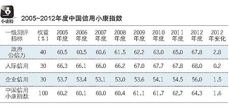 [导读]2011~2012年度中国信用小康指数为64.3分,比上年度提高1.6个百分点,其中“政府公信力”这一单项指标比上年度提高2.8个百分点,是中国信用小康指数的三大单项指标中升幅最高的。 2011~2012中国信用小康指数:64.3 社会信用趋于好转 透明度对政府信用影响最大