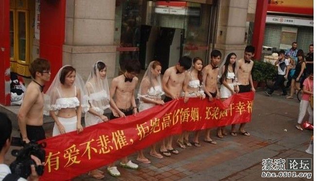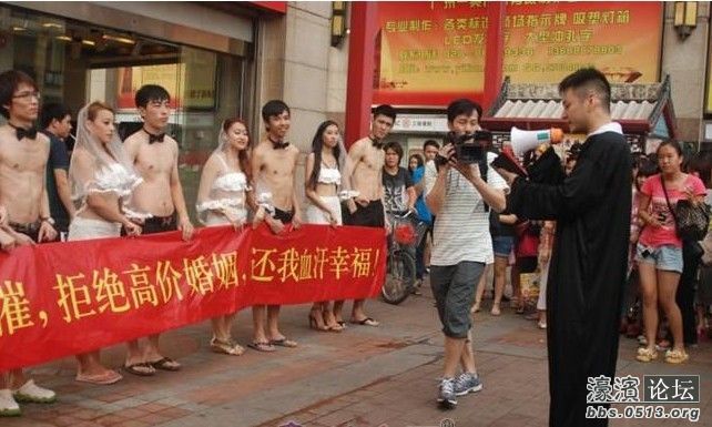 23日下午,在北京路步行街某广场,十名裸上身、戴领结、穿黑裤的年轻男子,与十名头戴白色婚纱头纱、身着清凉白色比基尼的年轻女郎,成双成对站在牧师面前宣誓结婚。他们身后还竖立着一幅大型横幅,横幅上大字写道:“有爱不悲催,拒绝高价婚姻,还我血汗幸福!”
