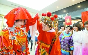 大红花轿、凤冠霞帔、媒婆丫鬟……昨天上午,重庆人民广场上,喜庆的锣鼓、唢呐声吹得热闹,一支特殊的迎亲队伍引来了众多市民的围观。