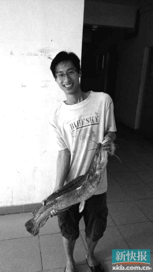 谢同学拿着大鲶鱼笑不拢嘴