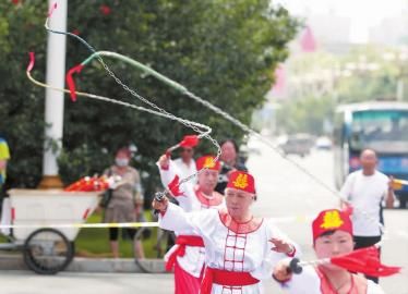 这群甩长鞭的人是吉林市少数民族武术协会龙雷鞭分会的会员。据龙雷鞭分会会长范松学秋介绍,目前,龙雷鞭分会会员共有30多人,此次前来的有近20人。龙雷鞭又称“麒麟鞭”,是一项老少皆宜的功夫运动,鞭子由牛皮手柄、钢链、尼龙鞭鞘组成,长度根据个人身高而定,重约1公斤。甩鞭看似简单,却有许多鞭法,此次虽然只打了两分多钟,却蕴含了21式打法,共打出82响。“比如越步劈鞭,意味早生贵子,背后接鞭意味百年好合。”