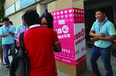 下午3点,1个近2米高、1米宽的大包裹纸箱出现在红衣小伙子面前,两位快递员举起纸箱,里面竟是个身穿淡藕色雪纺裙、手捧鲜花的姑娘。原来,这位姑娘把自己打包成“七夕礼物”,送给相恋4年的男友。
