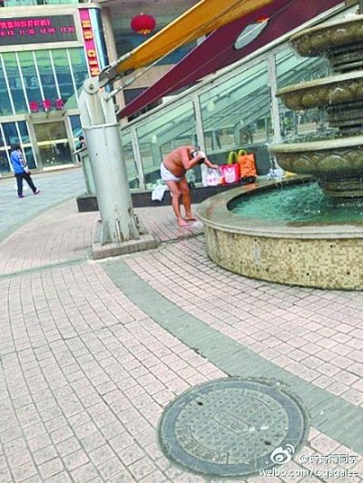 男子大街上用喷泉洗澡 仅穿内裤(图)