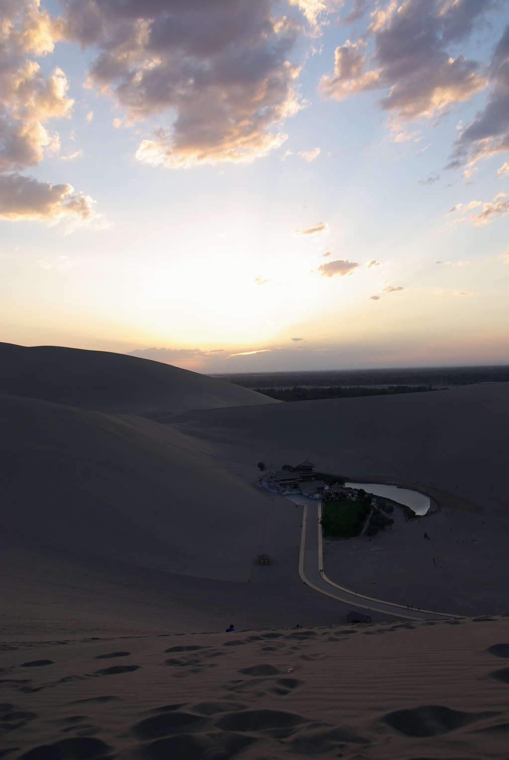 晚上6点,太阳依旧耀眼,我们从酒店打出租车去鸣沙山(敦煌真得很小,一会就到了)