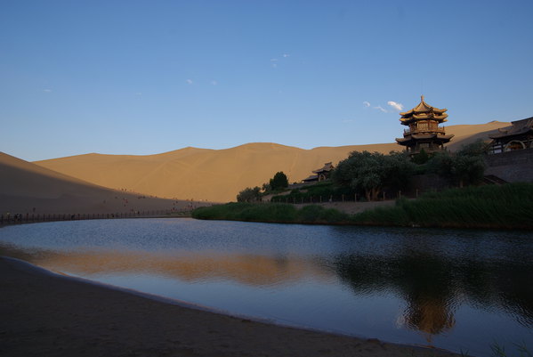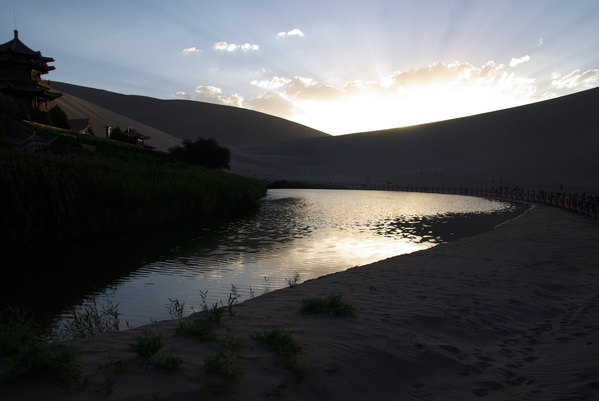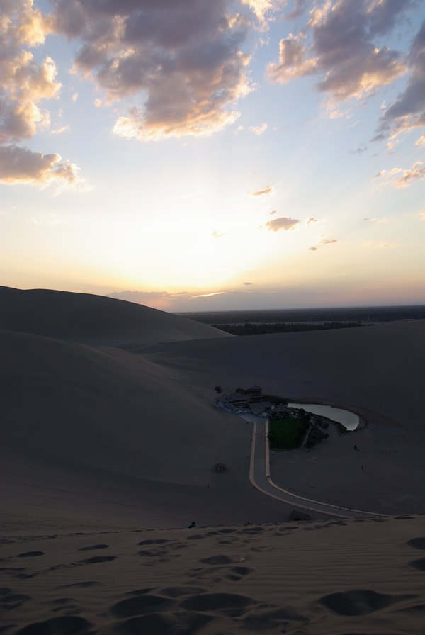 进了景区大家不要一激动就去爬那个铁鱼背(年轻人体力好那是要爬的),老年儿童就直接从修好的路大踏步去月牙泉玩玩沙子,偷懒的中年人可以从搭好的木梯上爬,省点力气。晚上9点半,太阳才依依不舍下山去。