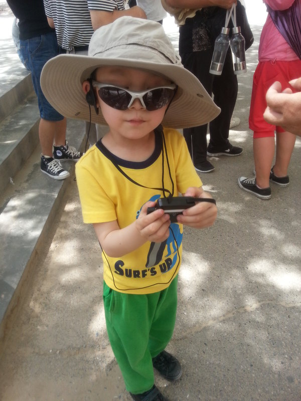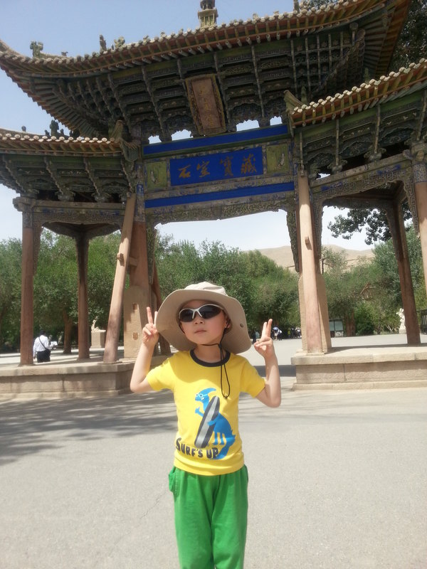 中午虽然太阳暴晒,但是到莫高窟主要是进洞看壁画,洞里凉快的很。10年前来着时候,讲解员还是拿着喇叭喊,现在有了先进武器:每人配备一个类似收音机接收器一样的东西,带着耳机,在有效距离内可以听见讲解员通过她的话筒发出的声音。另,小朋友对壁画不是很敢兴趣,算是白来一趟。