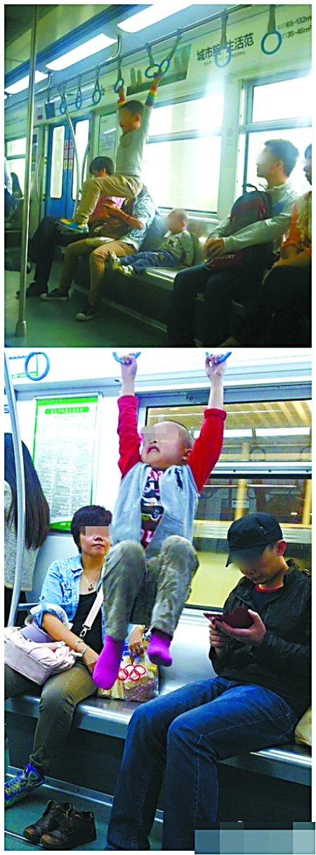 重庆轻轨“熊孩子”将扶手当吊环 家长熟视无睹