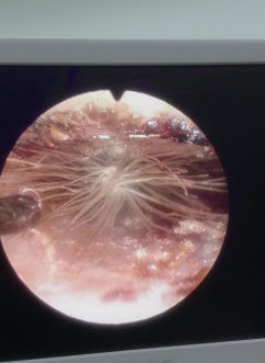 通过内窥镜屏幕可清晰看到耳道内“长”出的蒲公英