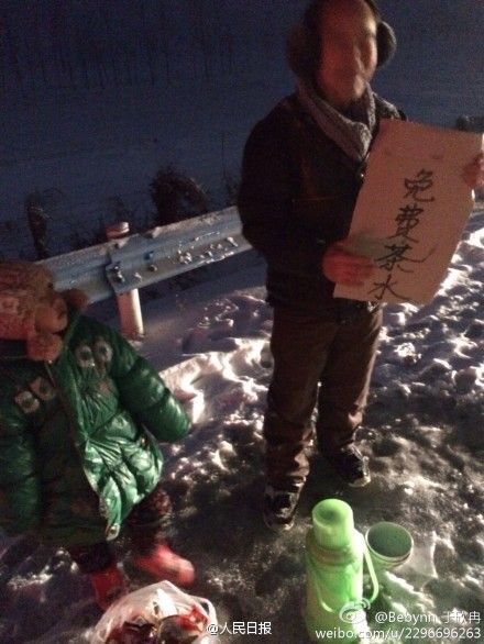 “快看,路边有人举个牌子,免费提供茶水呢。”于欣冉看到后很惊奇,就和母亲将车停路边与老汉交谈,得知他是附近村民,感觉风雪天会有不少人困在路上,就烧了一壶开水,想给行人取暖解渴,由于小孙女在家无人看管,就带她过来了。