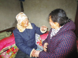 ■刘丽娟(右)为救自己多处被狗咬伤,殷老太太心疼不已。