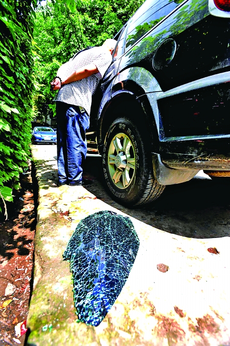 市民打望车窗玻璃被砸的车辆 昨日凌晨,南岸区觉林寺附近9辆轿车玻璃被砸,其中3辆在停车场内。所幸车主们均未在车内放重要物品,大家仅损失十余包香烟。记者了解到,有车主当晚曾听到玻璃碎裂声,但因楼下无路灯漆黑一片,不敢下楼查看。