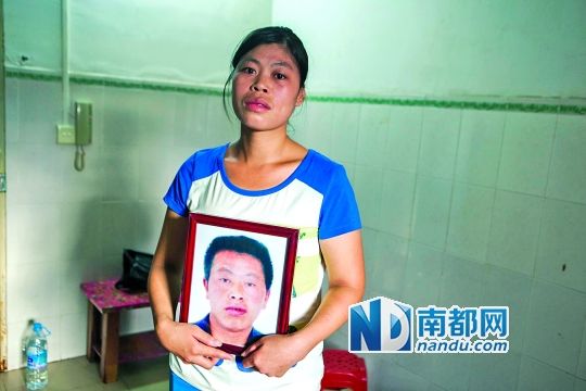 唐小姐抱着丈夫的遗像。她说老公没发病的时候是很爱她的。南都记者 王子荣 摄