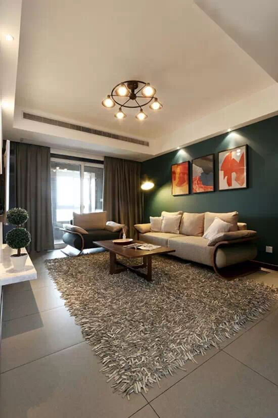 深绿色沙发背景墙与浅色地面相搭,在柔软的灰色地毯衬托下,整个客厅显出一种舒适温馨的感觉,在纯色墙面上并列挂放上三幅色彩艳丽的装饰画幅,使客厅空间都显现出一张艺术氛围。