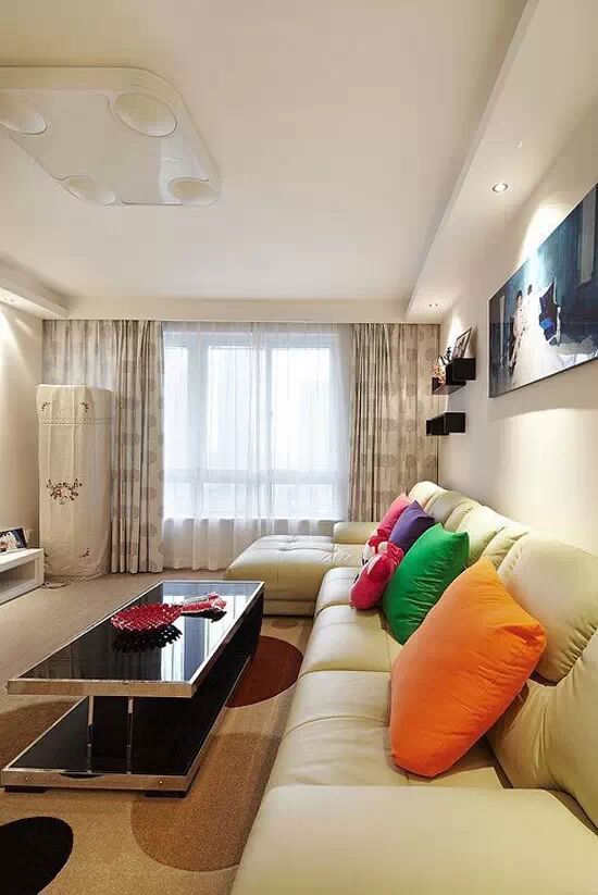 以浅色系打造踹的客厅中,不管是吊顶还是墙面都十分简约,而以多彩的抱枕来作为这一空间的色彩点缀,让这间客厅看上去显出一份多彩靓丽。