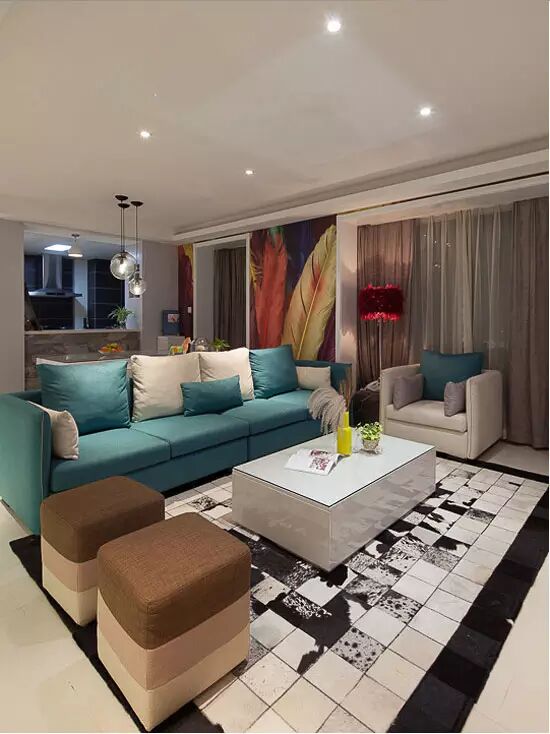 蓝白相间的沙发与黑白相间的抽象图案地毯,让这一客厅空间中充满了独有的个性,沙发旁的墙面上更是以大幅的彩色叶子元素来装饰整个墙面,整个客厅中虽然在色彩上略显丰富,但在整体风格上还是相当简约的,偏好彩色的业主不妨可以借鉴下这款客厅装修效果图哦。