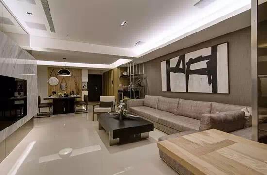 大地色系的客厅内,顶部简约的吊顶线条使客厅在视觉上显得大气,从舒适狭长的沙发看就能展现出这间客厅的舒适温馨感,纯黑色的茶几造型简约,在这一空间中倒也显出一种别致。