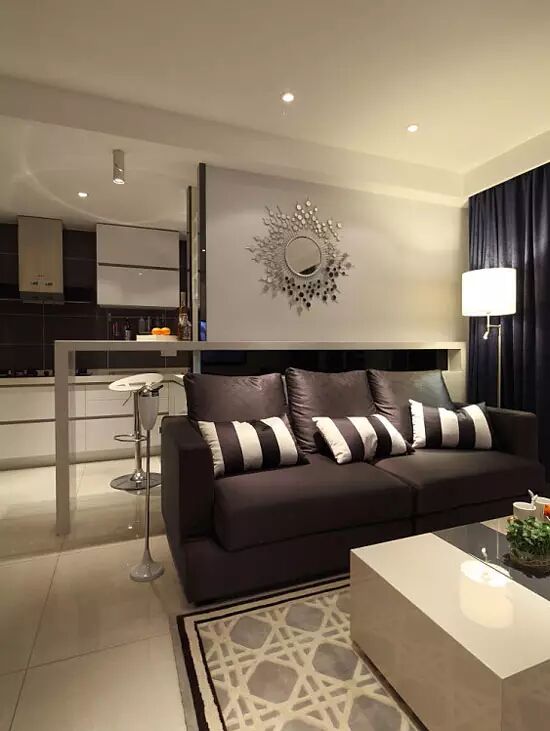 对于空间不大的客厅来说,这样的客厅装修倒也不错,小黑沙发与白墙作搭配,墙面上的装饰镜反射出客厅中的一部分空间,在光洁的地面上铺上一块舒适的地毯让整间客厅都显得更为舒适。