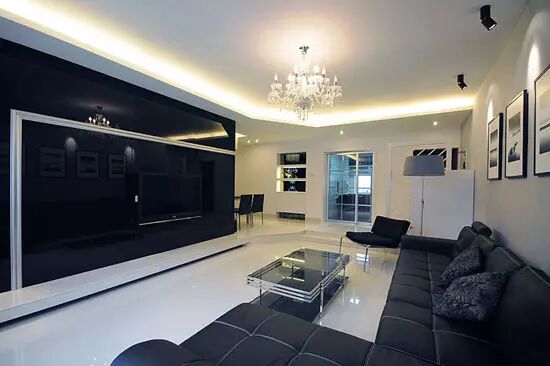 白色光洁的地面反射出窗边光景,让整间客厅依靠着这种自然反光显出明亮的视觉,淡淡的绿色墙面让这间客厅显出一份清新整间,黑色舒适的沙发放置于这一空间中与白色的沙发背景墙在颜色上形成对比,这样的一间客厅迸发出一种个性。