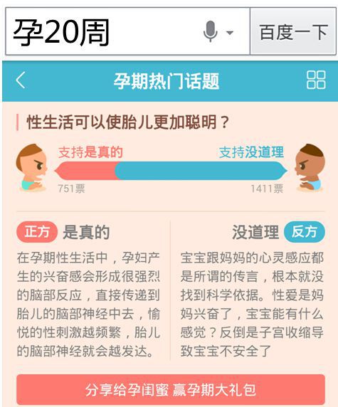 搜索“孕XX周”并对争议话题投票后,页面会自动跳转到知识解读板块。这里将为大家揭开谜底!据国内外的研究表明:夫妻在孕期恩爱与共,生下来的孩子不仅反应敏捷,语言发育早而且身体更健康。