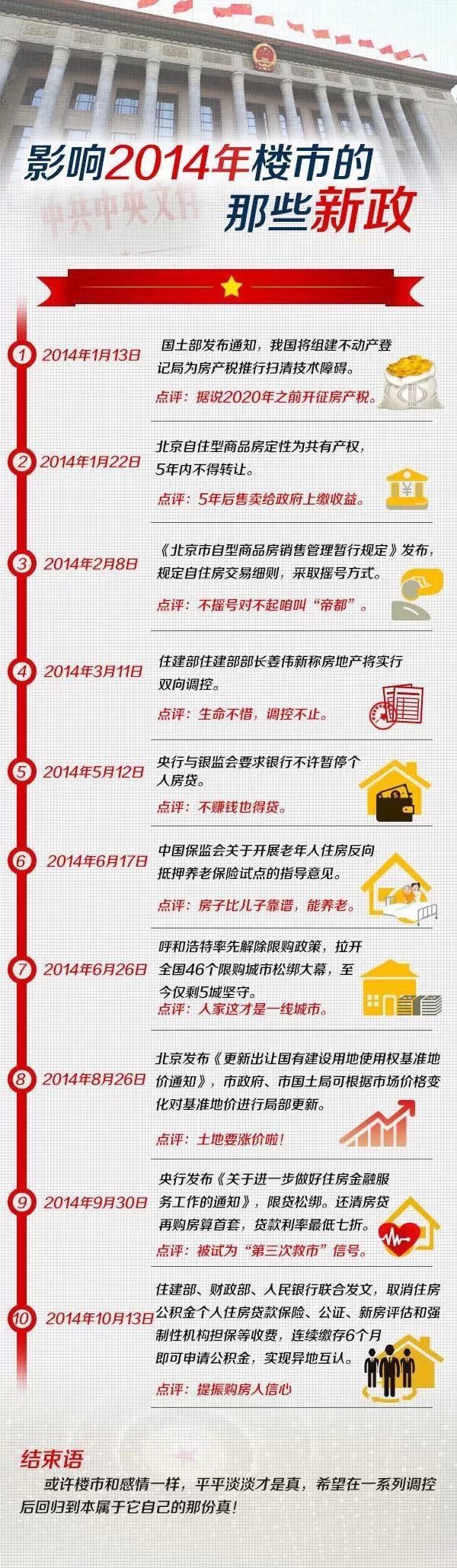 【易哥说】 2003年“121号文”、2005年“国八条”、2006年“国六条”、2007年下半年年内5次加息7次上调存款准备金率、2008年首套房最低首付20%利率下限基准利率7折、2010年“新国十条”“新国五条”、2011年“新国八条”、2013年“新国五条”……中国房地产新政不断,调控频率之高一直是大家关注的话题。 2014年,在三季度的持续低迷后,央行出台“9.30房贷新政”,大规模放松房贷,十月楼市成交逐渐回暖。一张图看今年都有哪些政策在力图改变市场,新政背后的意图又是什么?市场能够达到施政者的预期吗?