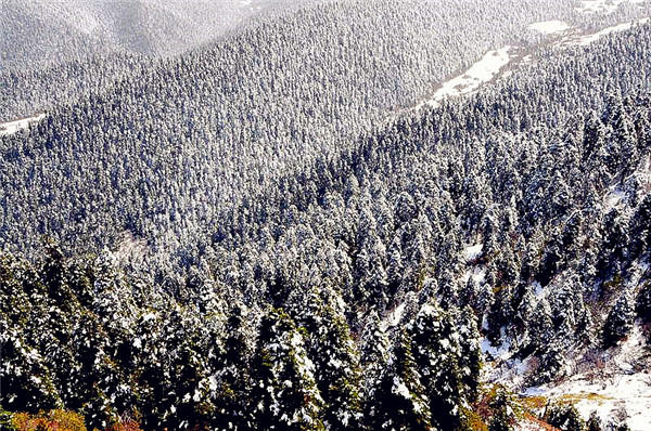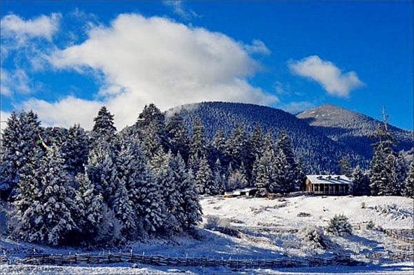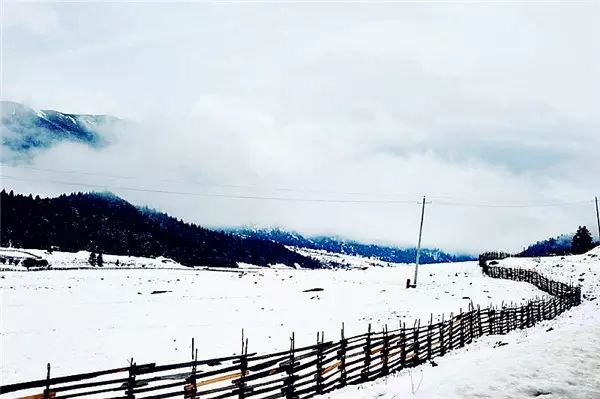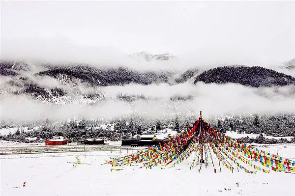 色拉季山的千年雪松挂着晶莹锡透的雾凇,原始森林环抱的鲁朗高山牧场一片欧陆风光。