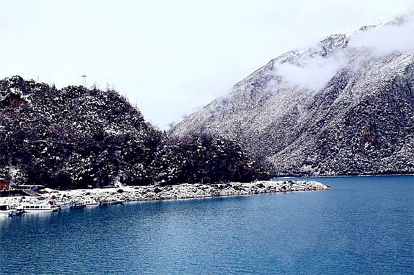 巴松错四周原始森林密布,与雪山和牧场相映成趣。