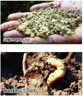 白蚁是天才建筑师,一个大蚁巢可能有多个副巢,但那只是白蚁的大粮仓,要找到蚁王蚁后生活的主巢也有诀窍。红头上带着钳子的是兵蚁,一旦发现危险,兵蚁就会从蚁道爬出“保家卫国”,却不知正好暴露了老巢的位置。 “顺着兵蚁来往最密集的方向,一定会找到主巢。 ”董德龙介绍。果然,一锹下去,比脸盆还大的主巢露出真容。