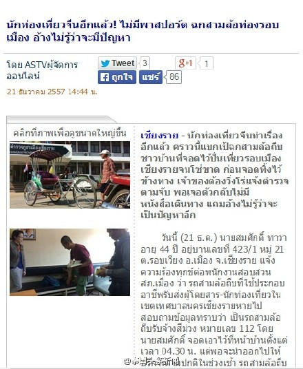 人民网北京12月21日电据@泰国头条新闻报道,12月21日,清莱府一名车夫报警称停放在门口的三轮车丢失,之后在三轮车协会帮助下找到有酒醉状骑走三轮车的中国游客王某。王某表示想骑车游清莱,看见三轮车没锁就骑走,直到把车链骑断才把三轮车丢弃在路边。让人寒心的是泰媒报道用的标题是"又是中国游客!"。