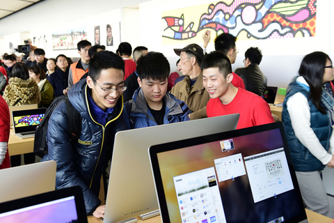 图为顾客在西湖苹果店内选购苹果的产品。 东方IC